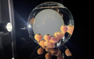 The result of a collaboration between artists and scientists from the Hydrodynamics Laboratory of the Ecole Polytechnique (LadHyX, Institut Polytechnique de Paris), the Light, Matter and Interfaces laboratory (LuMIn, Université Paris-Saclay), and the Physical Chemistry Institute (ICP, Université Paris-Saclay) the Volvox project is inspired by the eponymous microscopic spherical alga. The envelope of this freshwater alga is a biofilm connecting hundreds of independent cells. Spherical daughter colonies develop inside the sphere. To swim towards the light and feed, the movement of all the unicellular’s cells must synchronize, and the Volvox performs a dance alternating coherent movement and random reorientation. For the life sciences, Volvox represents a stage in the evolution, a step towards complexity, being a multicellular organism with mechanical and chemical communication between cells.