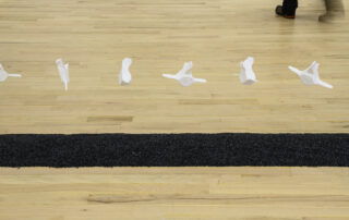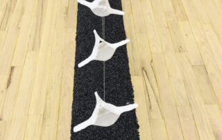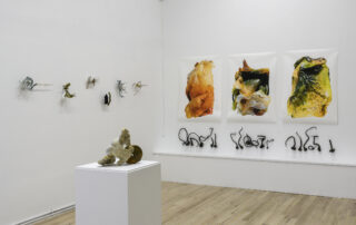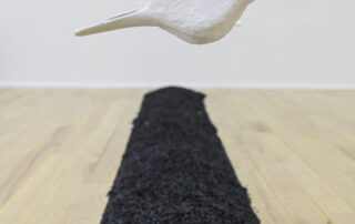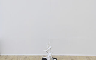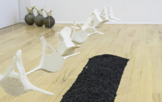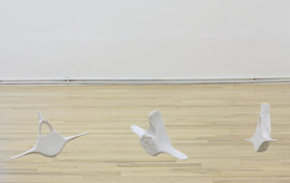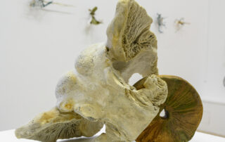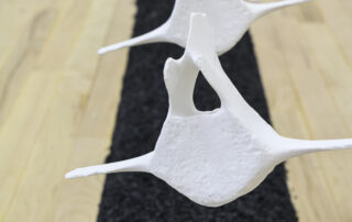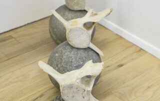 Á randi um Bæ gafst mér rými til að velta fyrir mér fallvaltleika heimsins, safna alls kyns mulningi og rannsaka skaðleg áhrif plastefna á lifandi verur. Fundið plastefni sýnir merki um að brotna niður í örplastagnir sem finnast í vatni, setlögum, lofti, regni og ís, auk líkama fólks og annarra dýrategunda. Þegar þessu er skeytt saman við fundna hryggjarliði úr hvölum og önnur dýrabein sjást tengsl plasts og lífs greinilega í verkum mínum. Í Tender Rituals VI voma þrívíddarprentaðir hvalhryggjarliðir yfir dökkum steinvölum, en efnið er ekki ljóst. Bein sem virðast úr plasti eru lífræn og niðurbrjótanleg en steinvölurnar eru í raun og veru endurunnið plast, ætlað til endurvinnslu: hvort tveggja eru vongóð efni frá framsýnum fyrirtækjum. Hvalbeinin og sjúskuð flotholtin í Tender Rituals IV tengja verkið við úrgang frá fiskveiðum, eins og t.d. net, og Tender Rituals VII sýnir gamalt flotholt umlukið dýrabeini. Bæði verkin fela í sér samband plasts og lifandi vera.