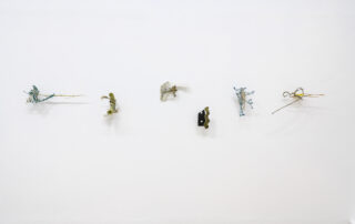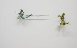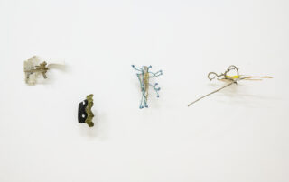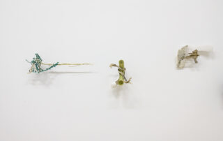 Ég safnaði þessu, auk annars efnis úr náttúrunni og bjó til röð af litlum skúlptúrum. Þeir eru innblásnir af skærlitu reipinu sem ég fann hálfsokkið í jörðina og flækt saman við þangið, eða litlu plastbrotunum innan um steinvölurnar á ströndinni. Fyrir mér endurspegla þessi verk skurðpunkta náttúrunnar og hins manngerða heims. Þau eru samræða á milli fagurs náttúrulegs umhverfis okkar og ágengrar nærveru okkar í náttúrunni, sem stöðugt þarf að taka vð áþreifanlegum merkjum um veru okkar þar.